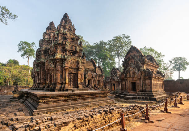 Banteay Srei is one of the few temples in the Angkor area that was commissioned by a Brahman, who may have been Jayavarman V’s tutor. The temple is square and has entrances on both sides, with a causeway connecting the east and west. The three center towers, which are embellished with male and female divinities and magnificent filigree relief work, are particularly interesting.